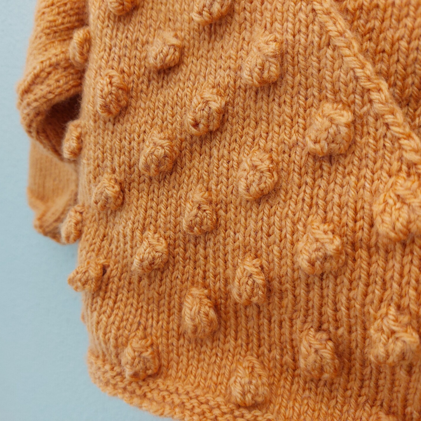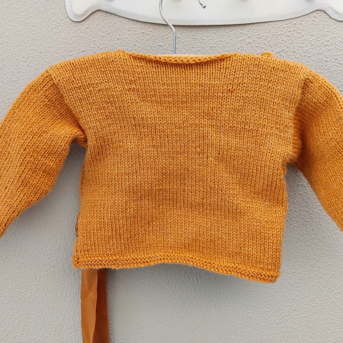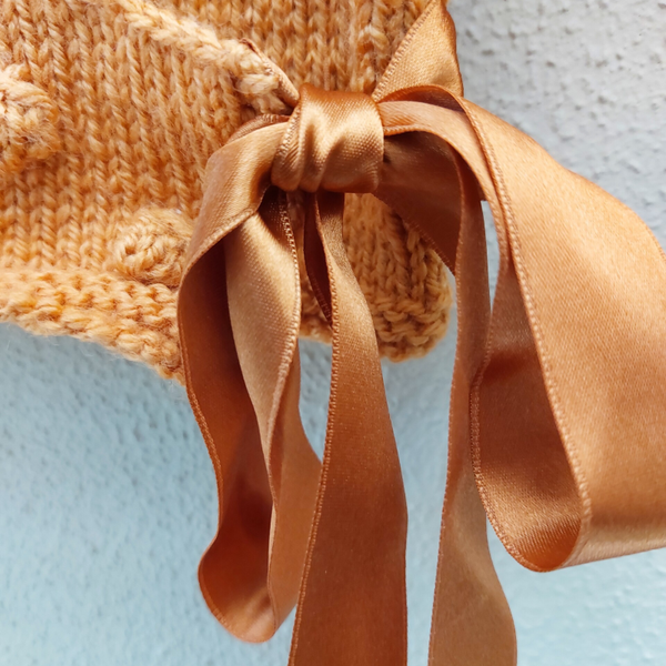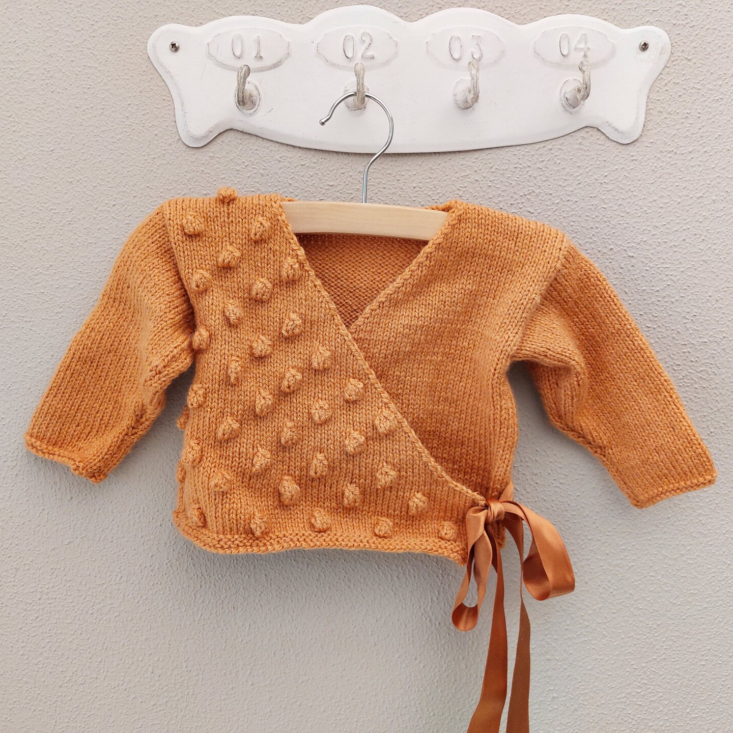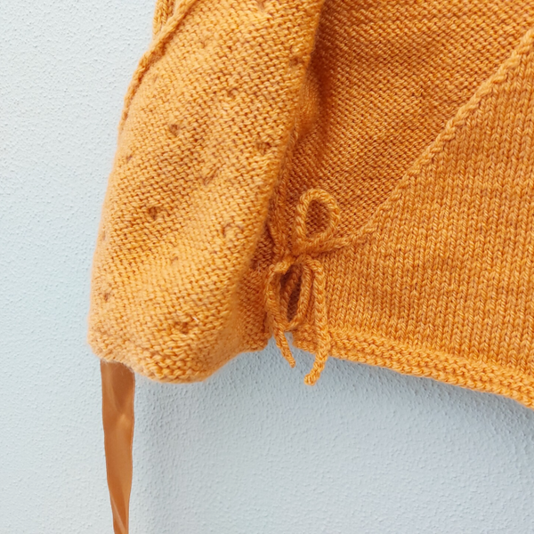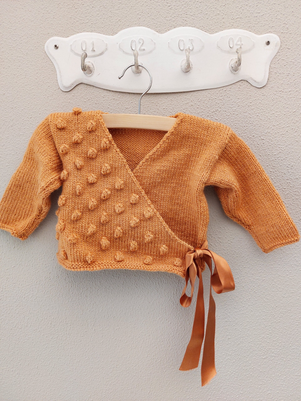 Een overslagvestje met noppen op 1 voorzijde. Het wordt gesloten met een satijnenlint. Aan de binnenzijde wordt het gesloten met een gehaakt koordje.