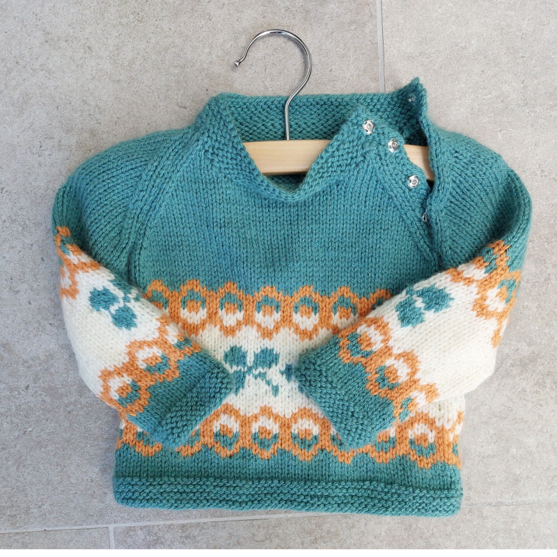 Een truitje in vrolijke kleuren, gender neutraal. De hals wordt gesloten met drukkertjes die verstopt zitten in de raglan naad.