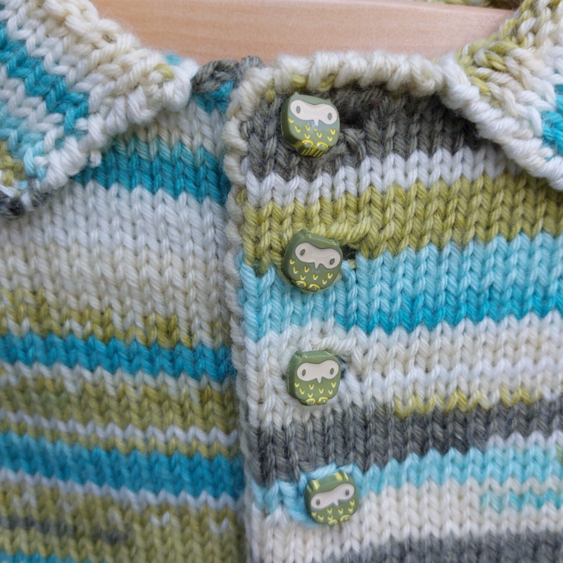 Een vrolijk jasje of dik vestje in verschillende kleuren groen en blauw op een achtergrond van ecru. Het vestje sluit met schattige uil knoopjes. Het voelt lekker zacht aan, door het Cashmere effect. Fijn voor je pasgeboren baby.